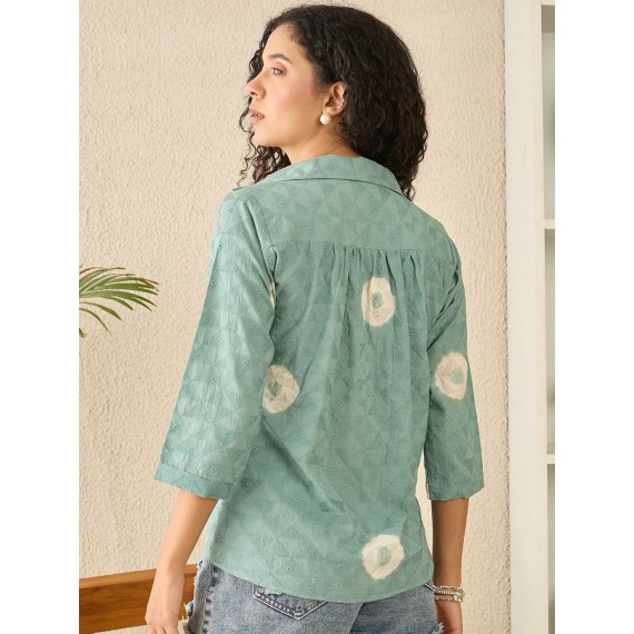 Green and white geometric printed relaxed-fit casual shirt, has a spread collar, button placket, three-quarter sleeves and curved hem
