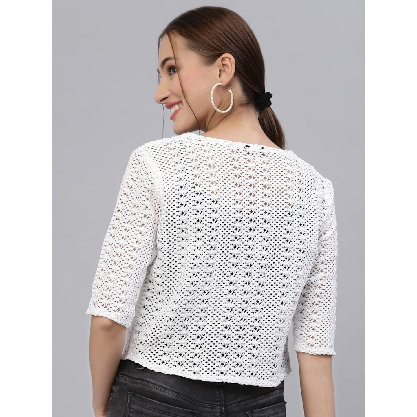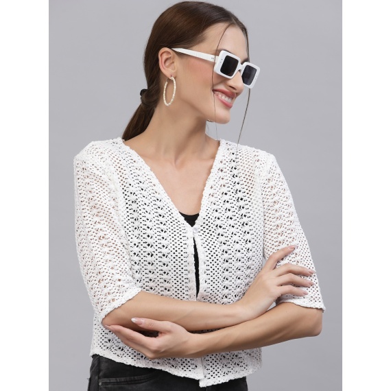White self design open front regular shrug ,has short sleeves, straight hem