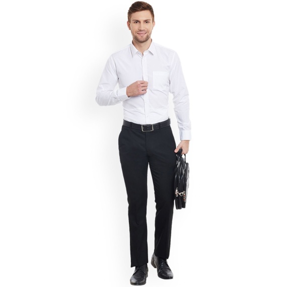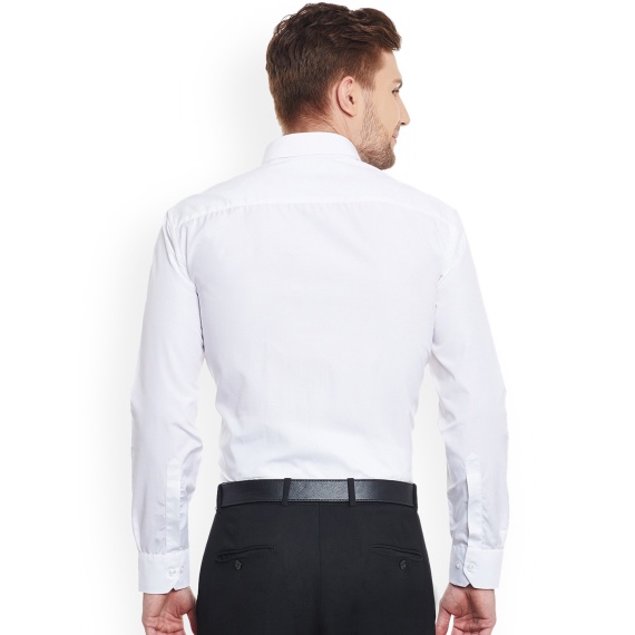 White solid formal shirt, has a spread collar, long sleeves, straight hem, one patch pocket