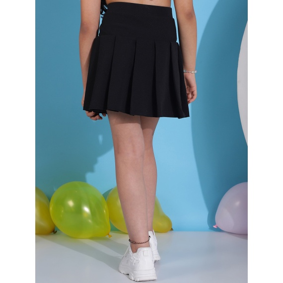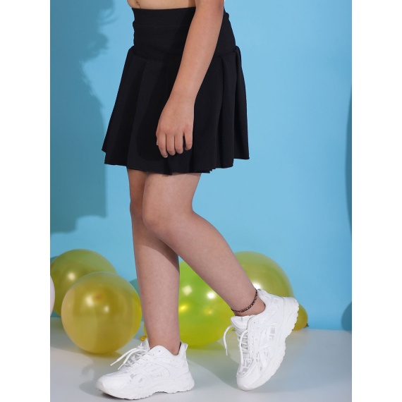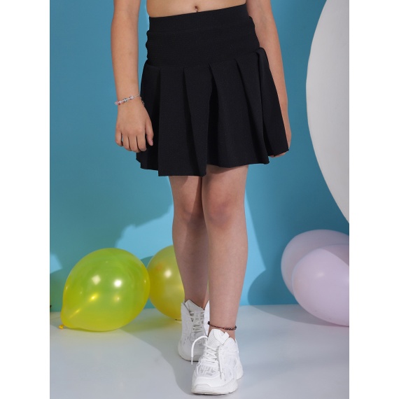 Black solid flared mini skirt with pleated detail, has an elasticated waistband with slip-on closure, and a flared hem