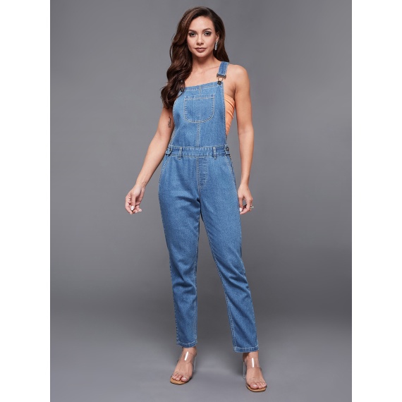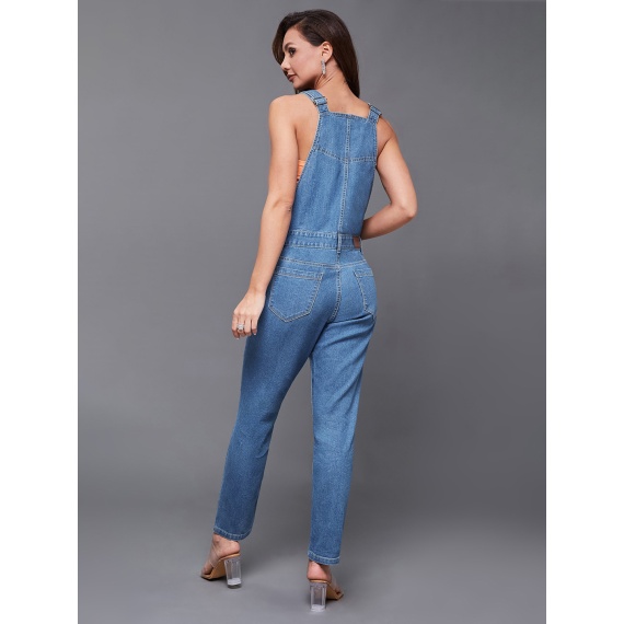 Blue solid denim dungarees, has shoulder straps, waistband with belt loops and button closure, 5 pockets