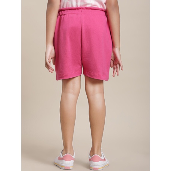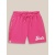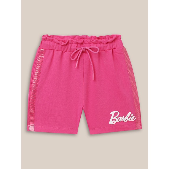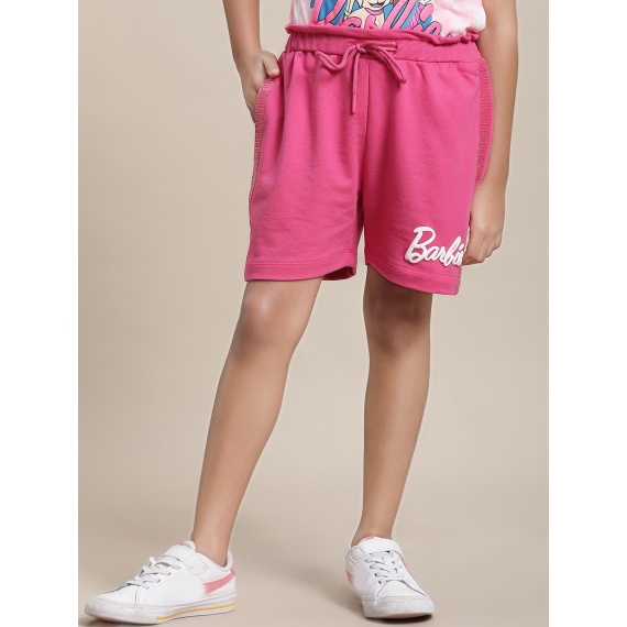 Pink & white barbie typography printed mid-rise regular shorts, has 2 pockets, has an elasticated waistband with drawstring closure